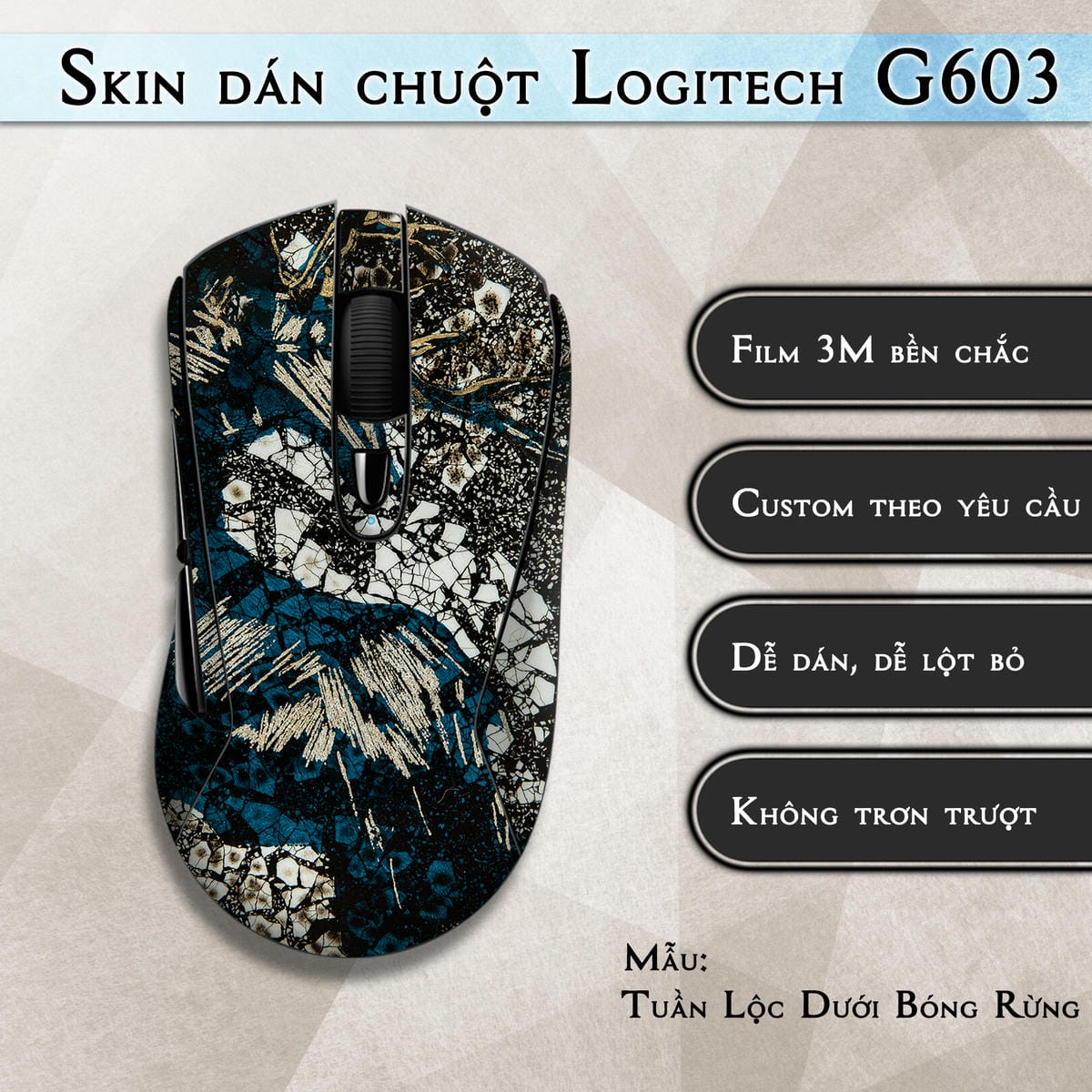 Bạn có ý tưởng riêng? Bạn muốn một thiết kế không đụng hàng? Chúng tôi nhận in skin theo yêu cầu của bạn. Chỉ cần gửi cho chúng tôi hình ảnh, họa tiết mong muốn, chúng tôi sẽ giúp bạn tạo ra miếng skin dán chuột Logitech G603 của riêng mình. Hãy để sự sáng tạo của bạn bay cao!