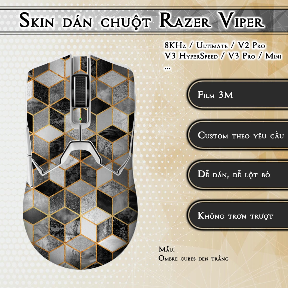 Chúng tôi cung cấp miếng dán skin được thiết kế và cắt chuẩn xác cho hầu hết các dòng chuột Razer Viper phổ biến, bao gồm: